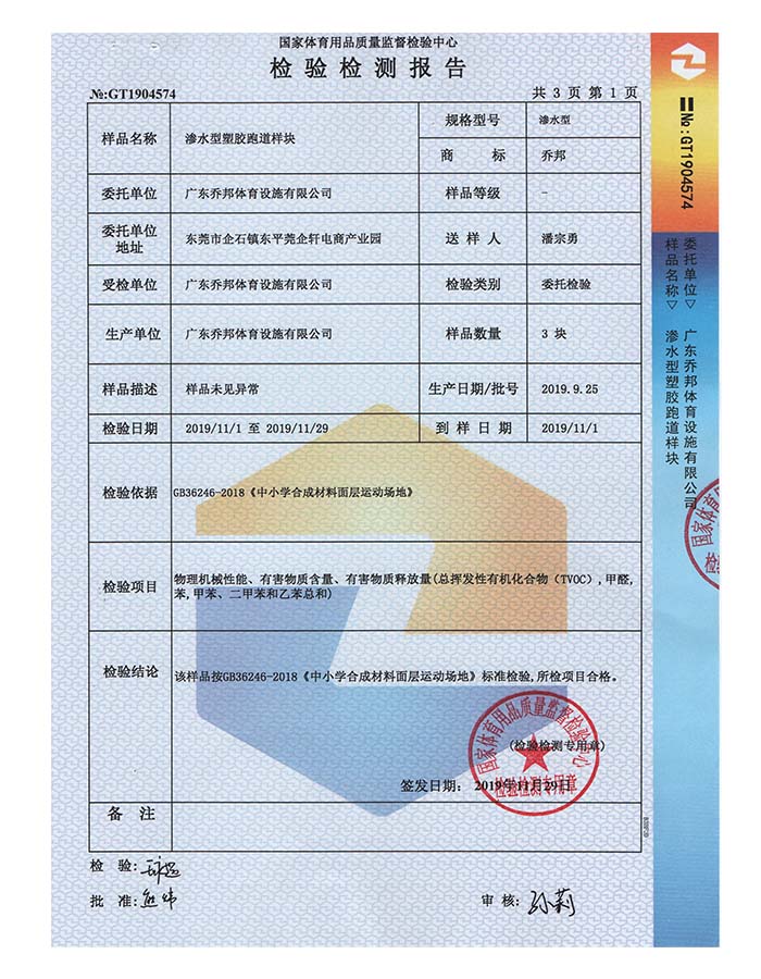 透气型塑胶跑道样块检验检测报告