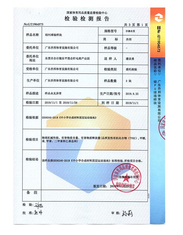 硅PU球场样块检验报告