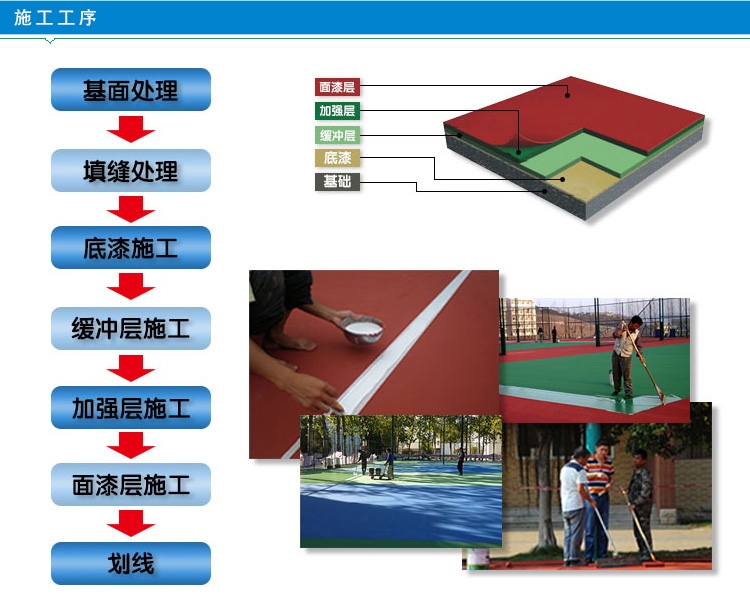 是一款绿色环保的水性材料,它是完全不含石棉,铅或水银等化合物,高度抗紫外线性能,颜色持久不褪色,经久耐用,超强耐磨,此款材料的颜色多样,有篮,红,绿等多种色泽可供选择,它的面层结构优越,有效的缓冲力能降低对运动员的伤害及疲劳,保养容易,维修成本低,在任何气候都能牢固使用,使用寿命长